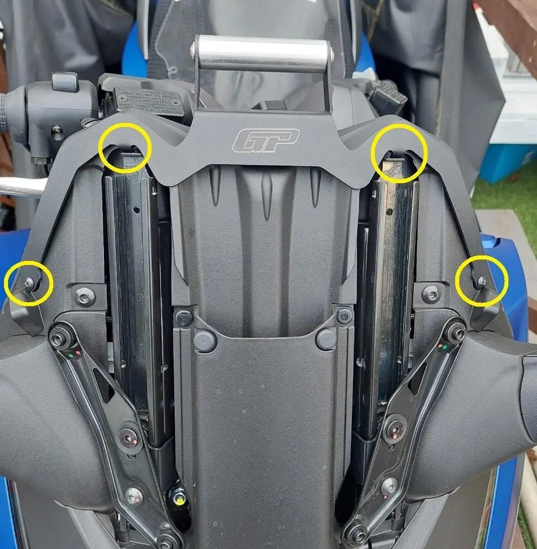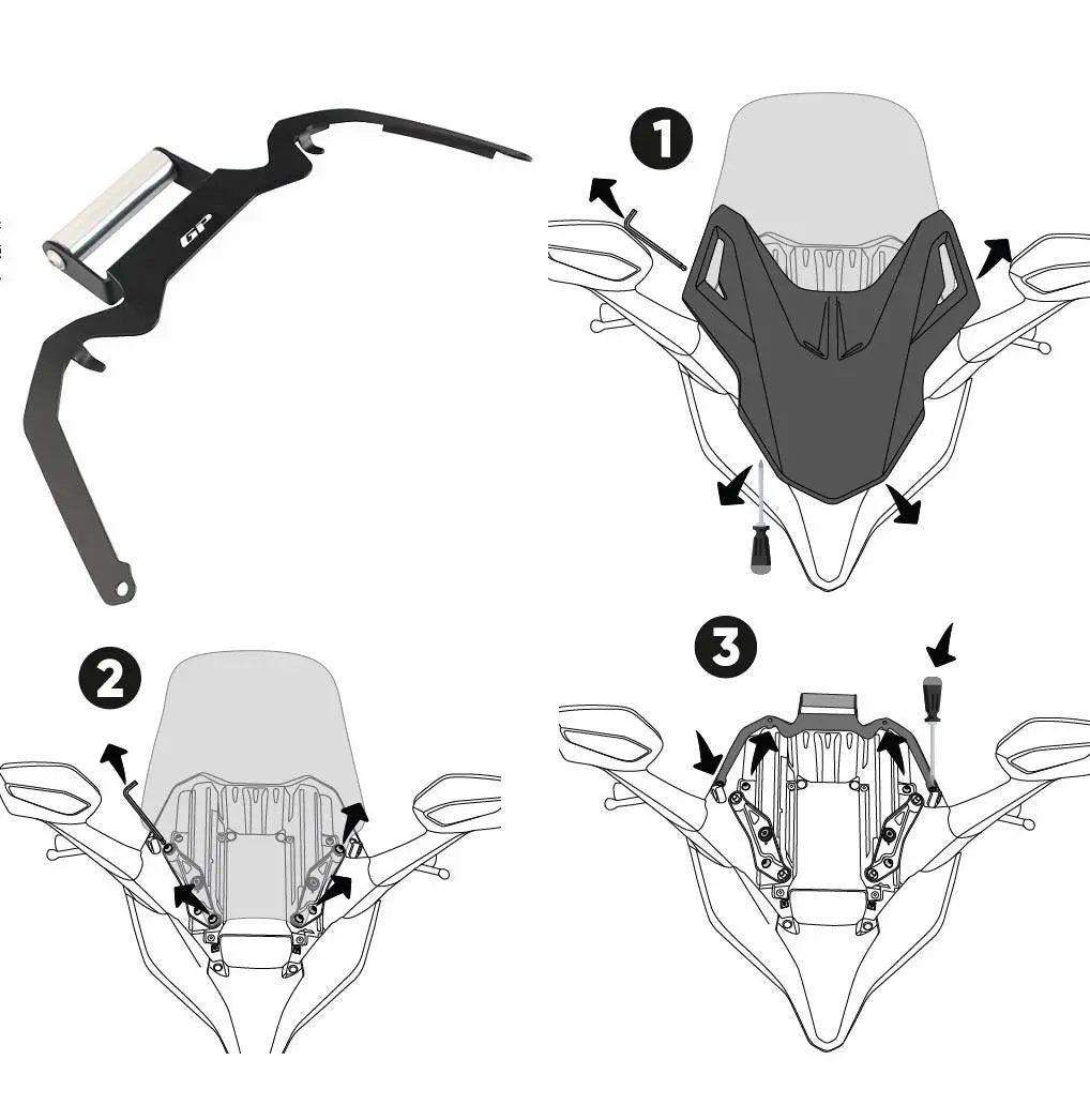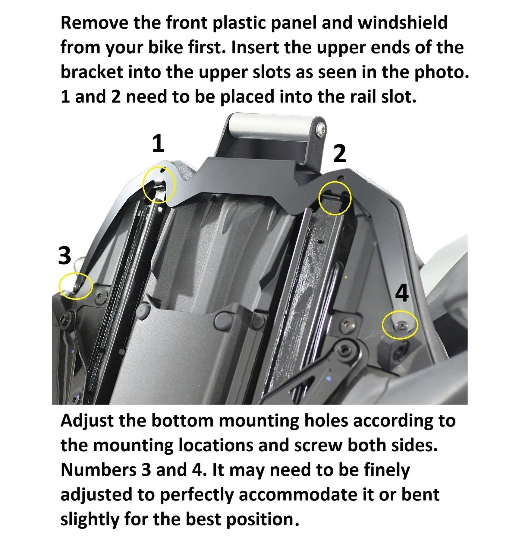 Note for the installation: Please remove the front plastic panel and windscreen from your bike first. Insert the upper ends of the bracket into the upper slots as seen in the photos. Numbers 1 and 2 need to be placed into the rail slot. Then adjust the bottom mounting holes according to the mounting locations and screw both sides. Numbers 3 and 4. It may need to be finely adjusted to accommodate it perfectly or bent slightly for the best position.
